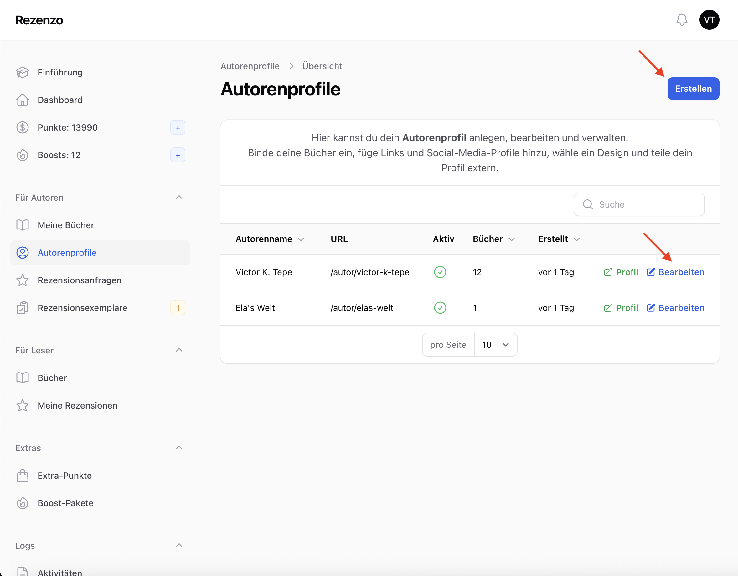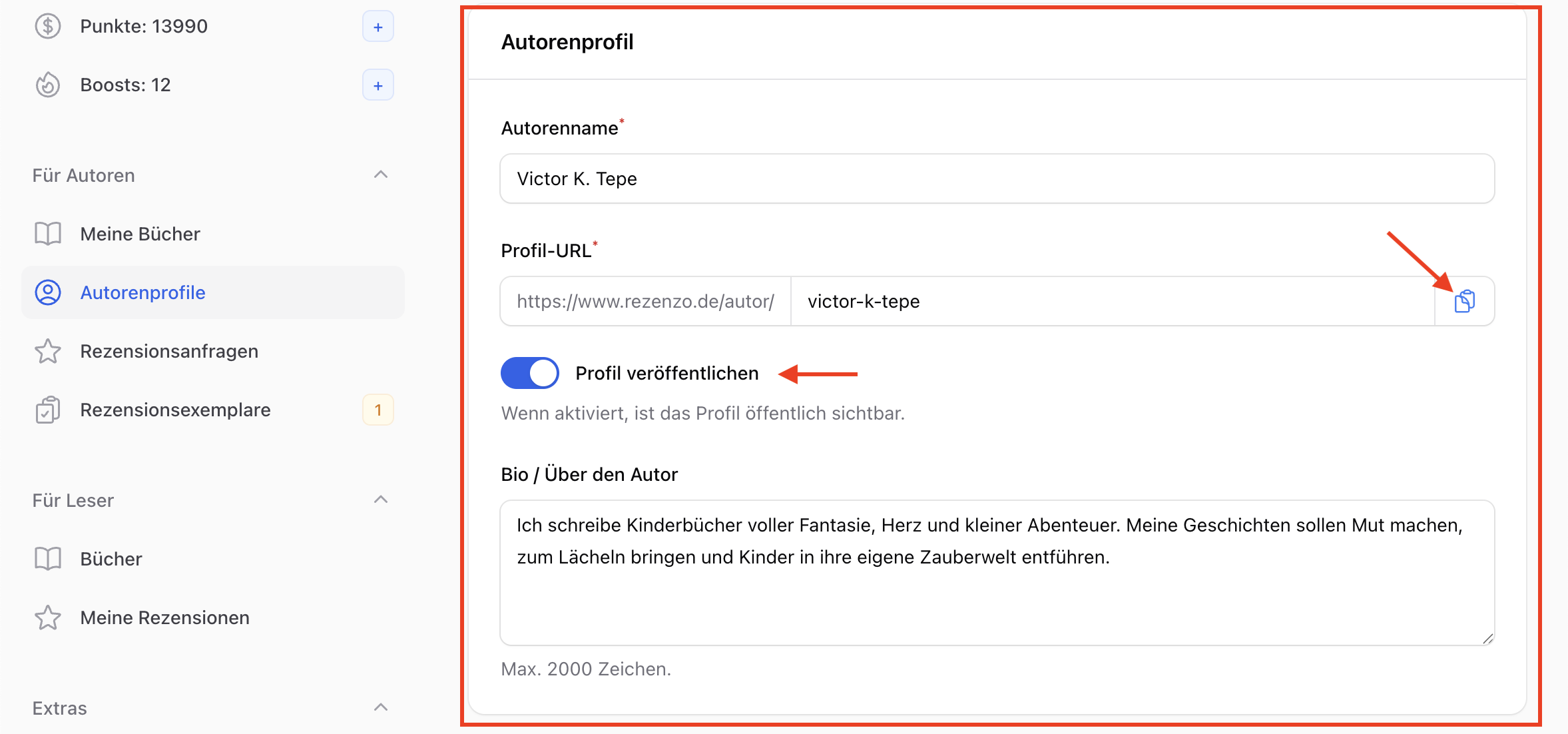 Die URL wird öffentlich unter https://www.rezenzo.de/autor/dein-slug erreichbar.