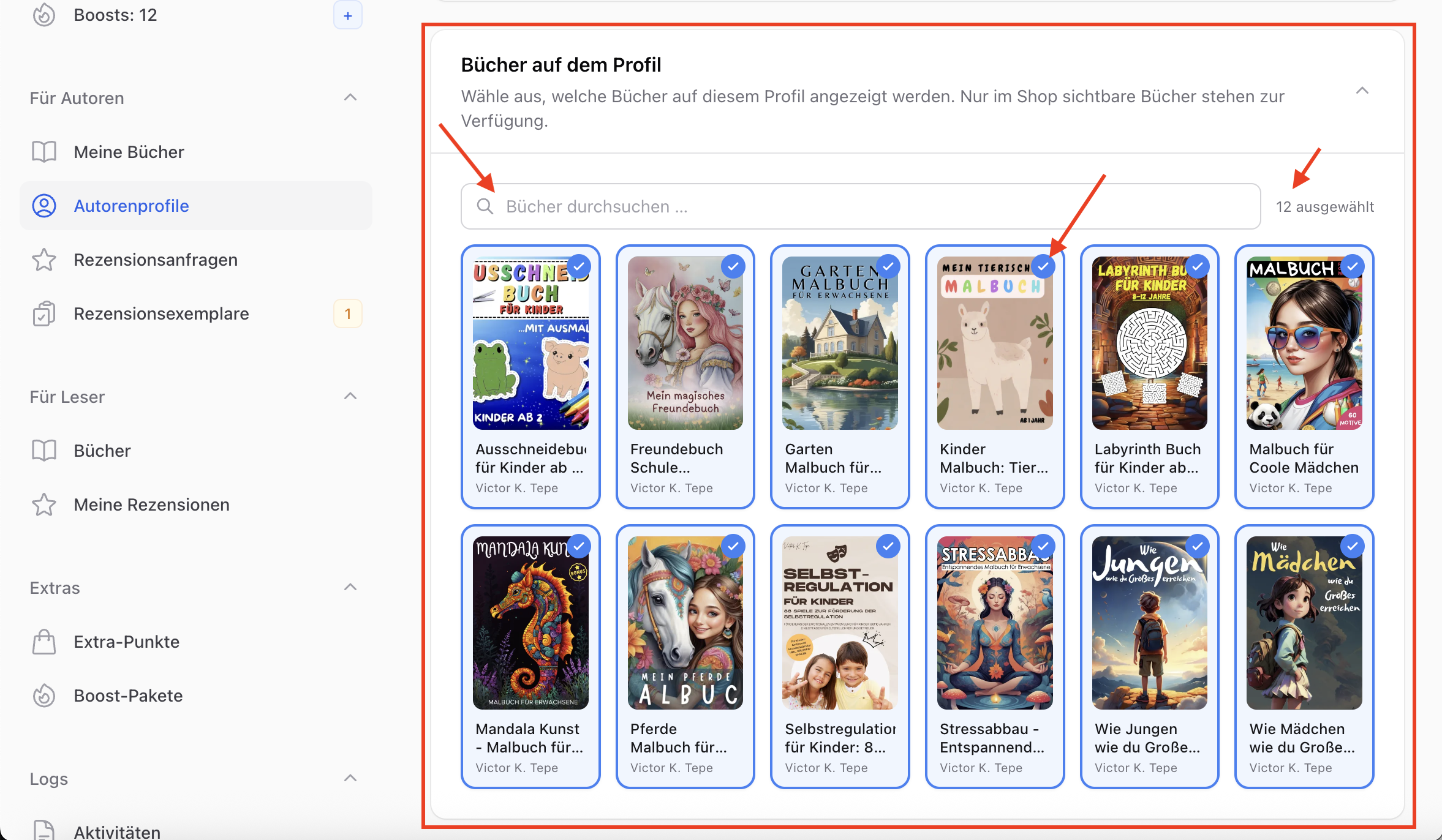 Im Bereich Bücher auf dem Profil:
