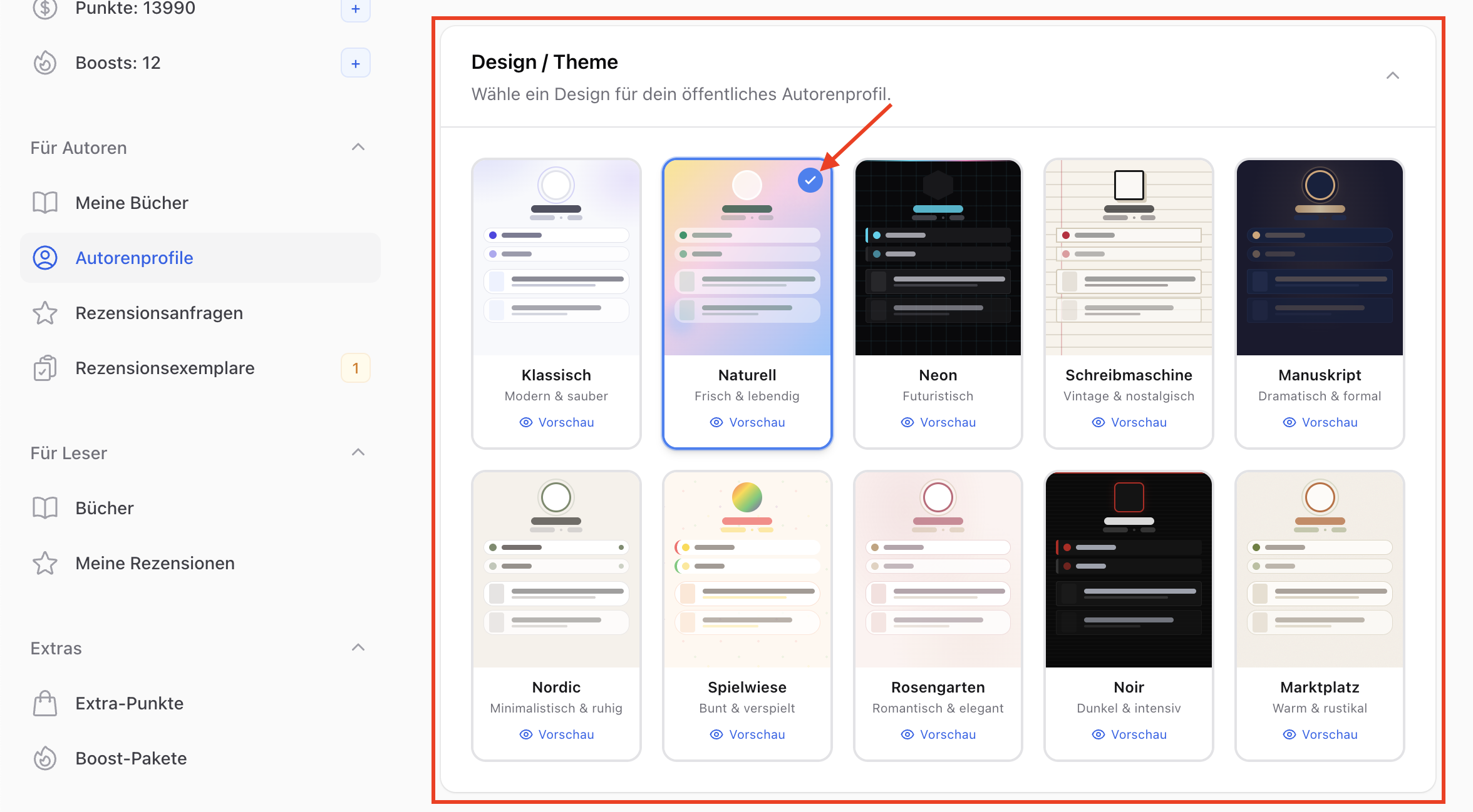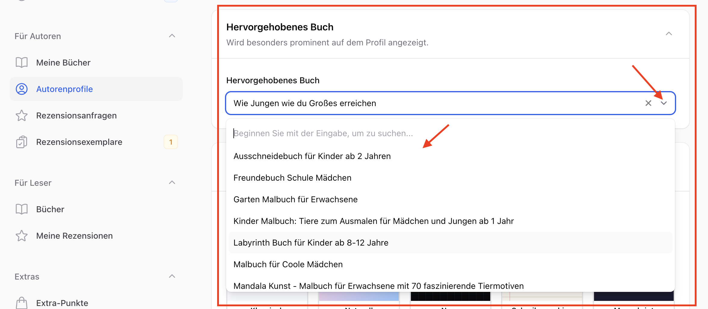 Im Bereich Hervorgehobenes Buch kannst du ein Buch auswählen, das auf dem Profil besonders prominent angezeigt wird.