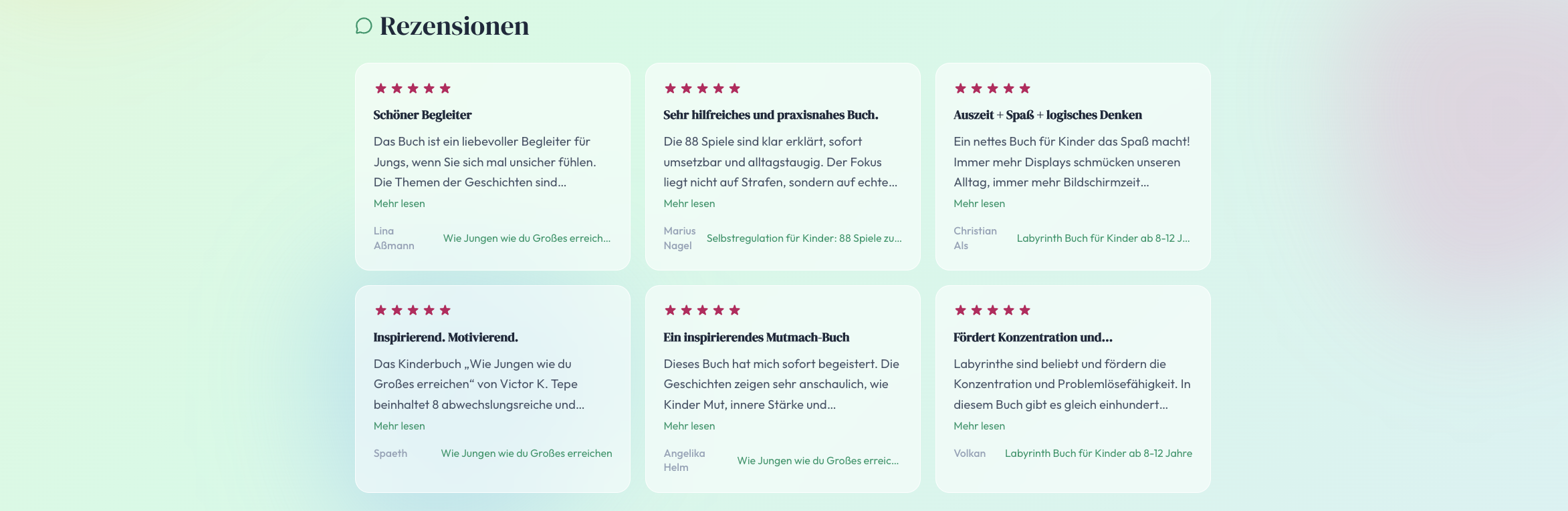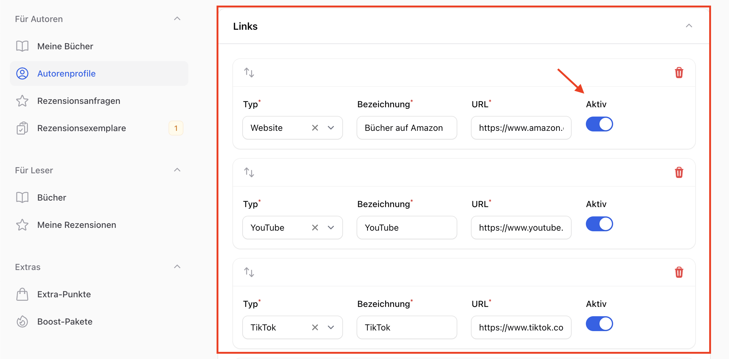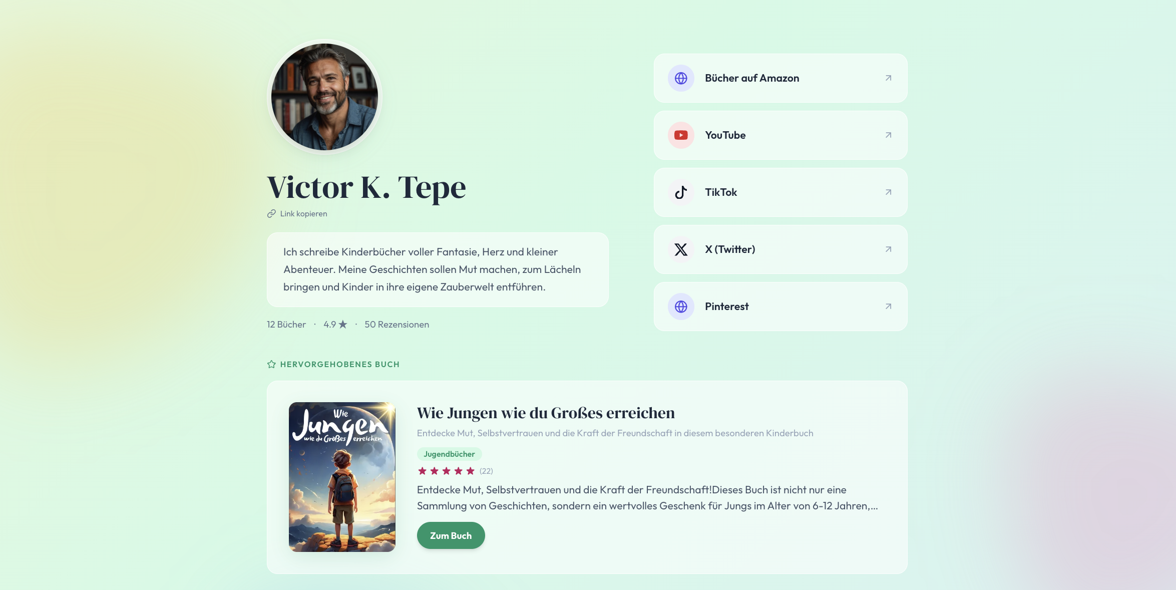 Dein Autorenprofil ist in wenigen Minuten eingerichtet und bleibt danach aktuell: Neue Bücher und Rezensionen werden übersichtlich angezeigt, und über deine Social-Media-Links können Leser direkt mit dir in Kontakt bleiben.